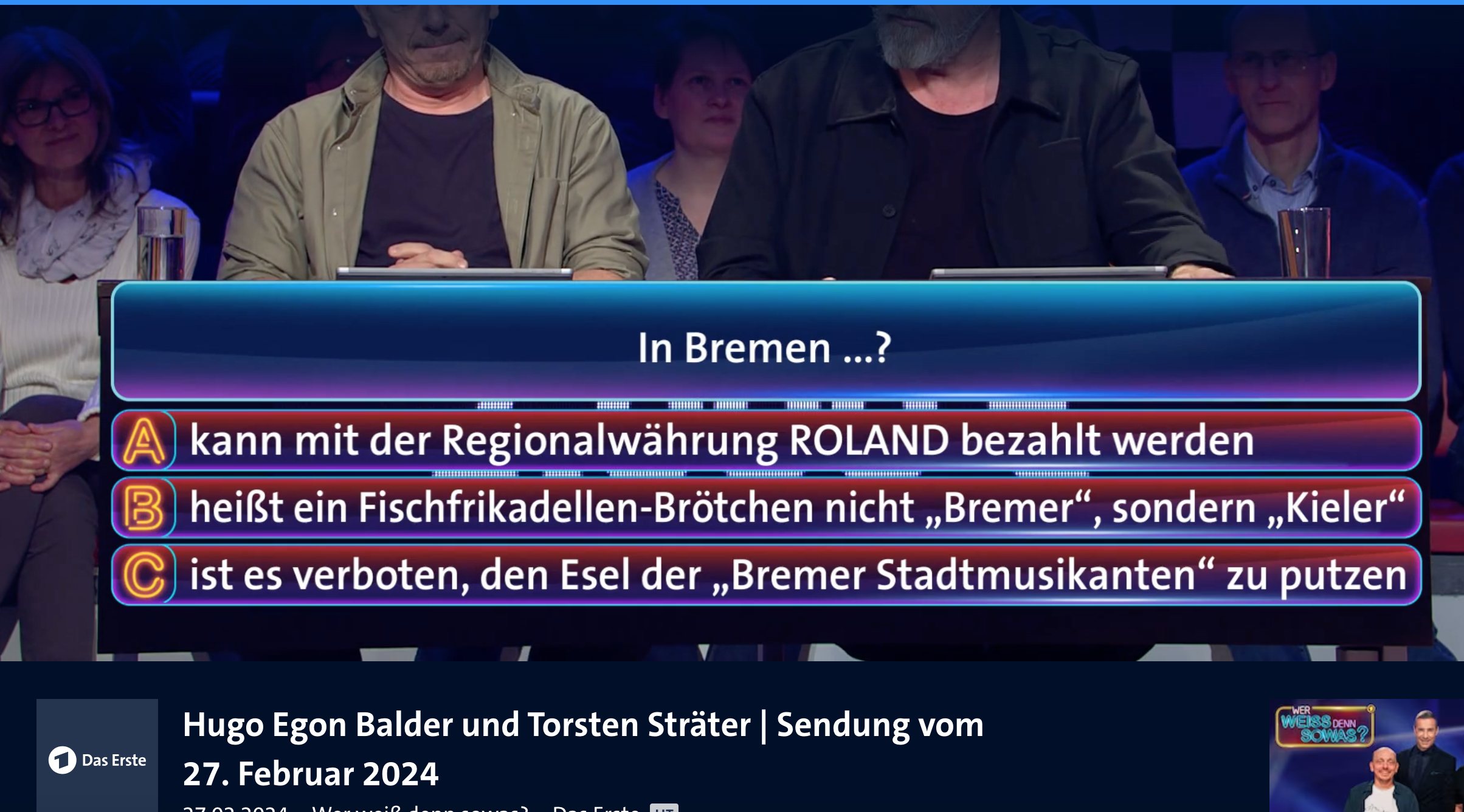 Am Dienstag, den 27.02. kam ?Wer weiss denn sowas? auf ARD um 18:00.